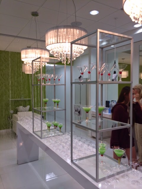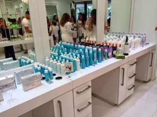 From there the room is divided by a set of glass and steel towers meant for what I can only assume are the display of products sold in-house. That night, they were being used for the drinks and light bites provided by D’Angelo Pizza-Wine Bar-Tapas Restaurant. There were products from brands like Moroccan Oil & Keratin Complex Style Therapy displayed along one of the walls where the stylists usually work their magic!