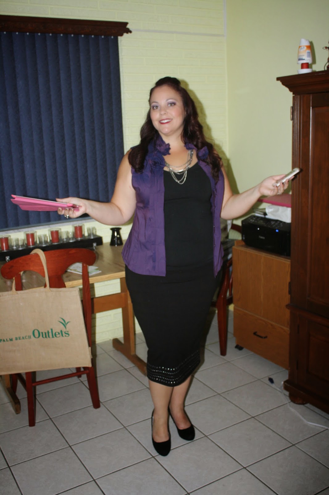 My second outfit changes everything up except for my really cool new studded midi skirt from Torrid, but looks totally different don’t you think??? The purple jewel-toned top is also from New York & Co. and is meant to be worn closed but I opted to wear it with my own black tank top to show off my really cool necklace. I changed up the shoes with a pair of black faux suede heels, also from Rack Room Shoes. All shoes were on sale buy 1 pair, get the 2nd at 50% off. I had to buy two pairs! They really twisted my arm;)