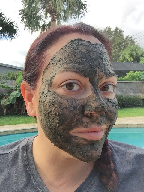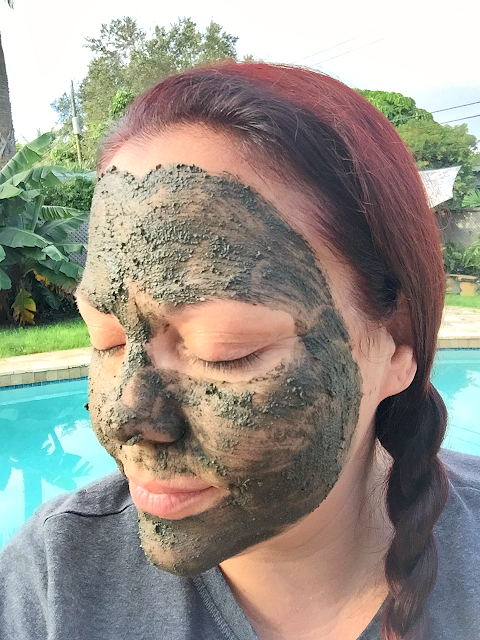 The masque base is a blend of Rhassoul and Bentonite clays, along with sea kelp, raw cacao, and charcoal powder. The grittiness of the mixture comes from ground organic almond meal. Directions state to rinse with warm water and use gentle, circular motions to help exfoliate the skin. This is where the ground almond comes in to help slough away the old, dead skin cells and reveal a much healthier, more radiant skin underneath.