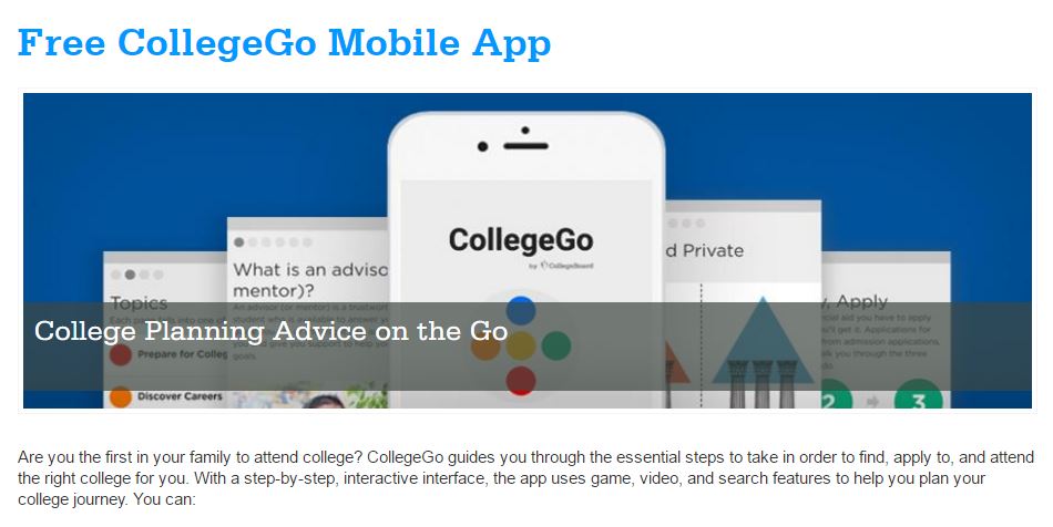 The CollegeGo mobile app guides students through the essential steps in the college application process with different interactive features, such as games and videos.