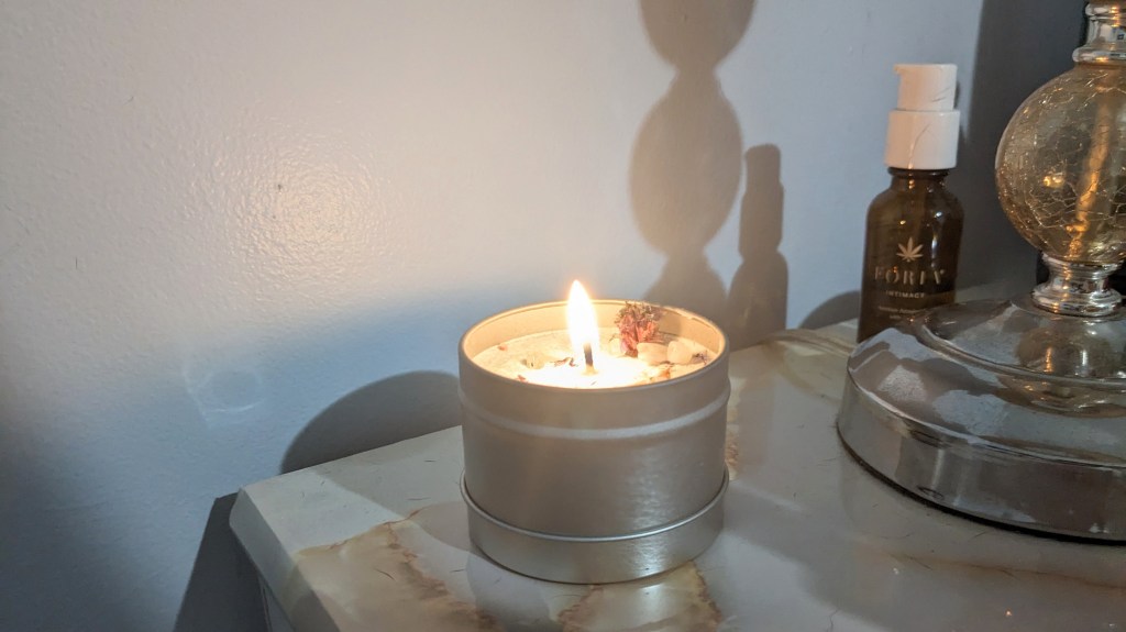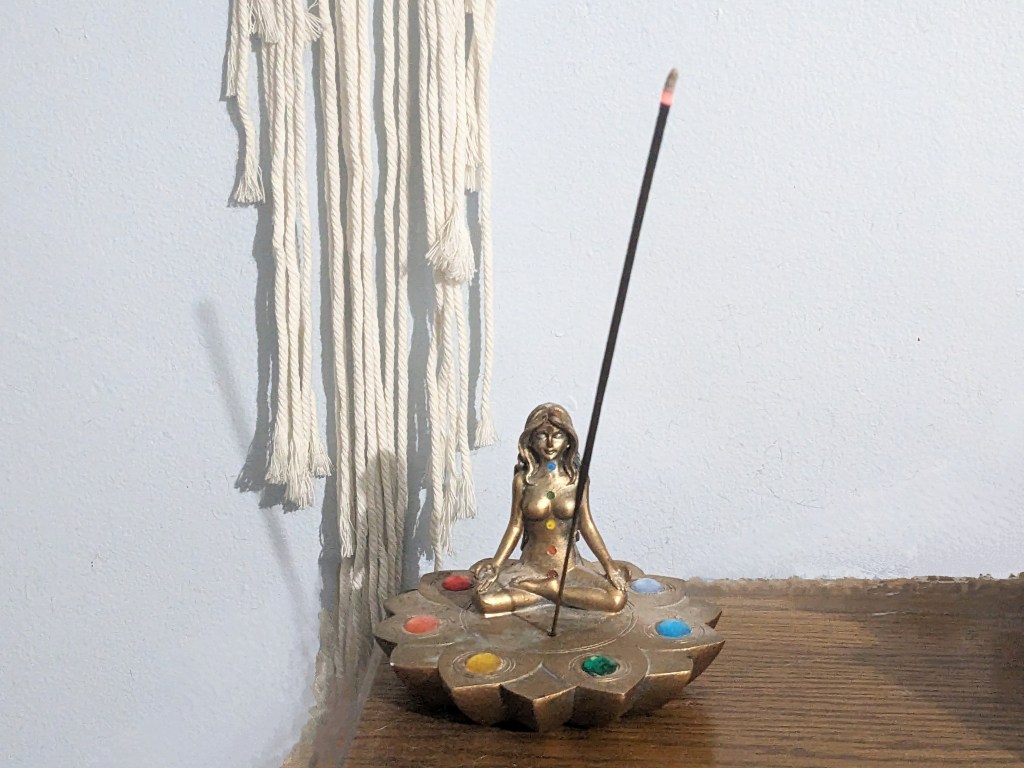 I love the warmth and glow created by candles, so usually I start by dimming my bedroom lights and lighting a candle (or two) to illuminate my space. I also love incense…My husband does too, thank goodness, so I love setting one in my chakra goddess incense holder my daughter gifted me. She took a trip to New Orleans in 2021 and brought me that holder plus some Dragon’s Blood incense from the shop, Dark Matter Oddities & Artisan Collective. I especially love the scents Vanilla, Dragon’s Blood and Sandalwood, but I’m usually pretty open to many, as they all speak to me in different ways🕯️